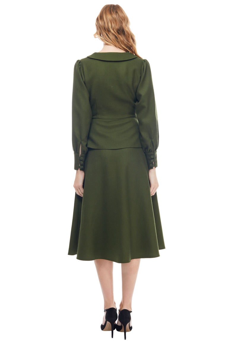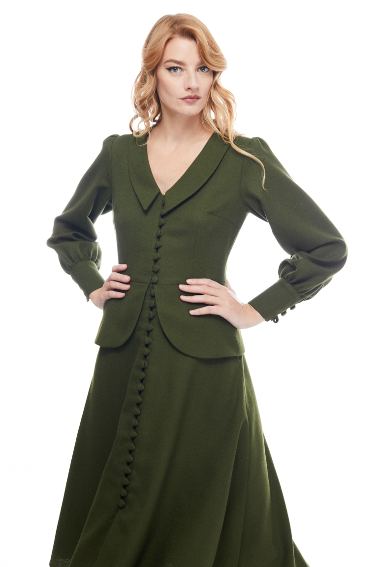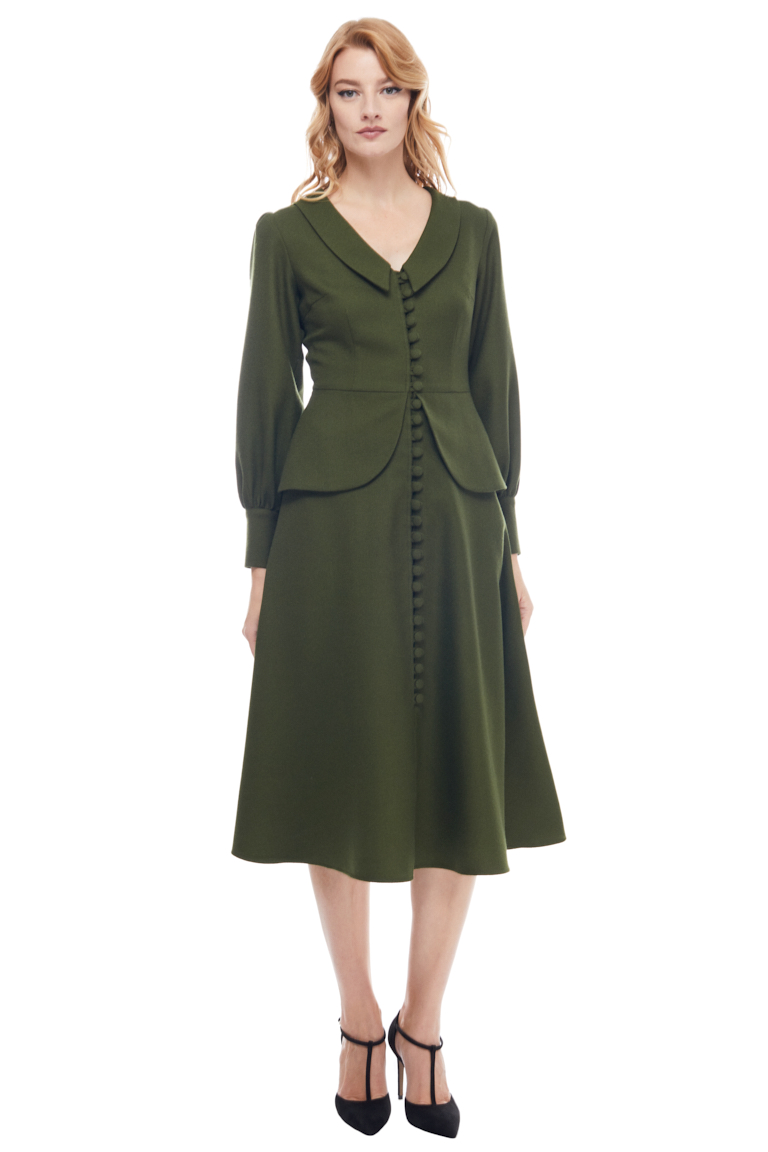 This midi dress has a feminine ‘40s inspired silhouette. Cut from light wool, it has puffed sleeves with button cuffs, tonal button fastening through front and in seam pockets. With a sweet peplum around the waist and a beautiful Chelsea collar, it is designed to be fitted at the bust and waist, loose at the hip.