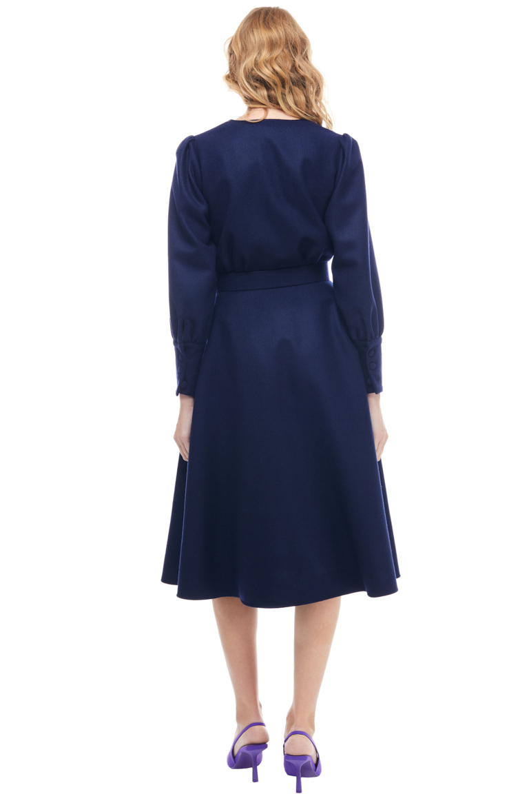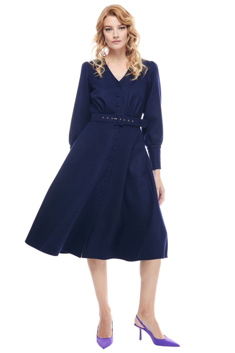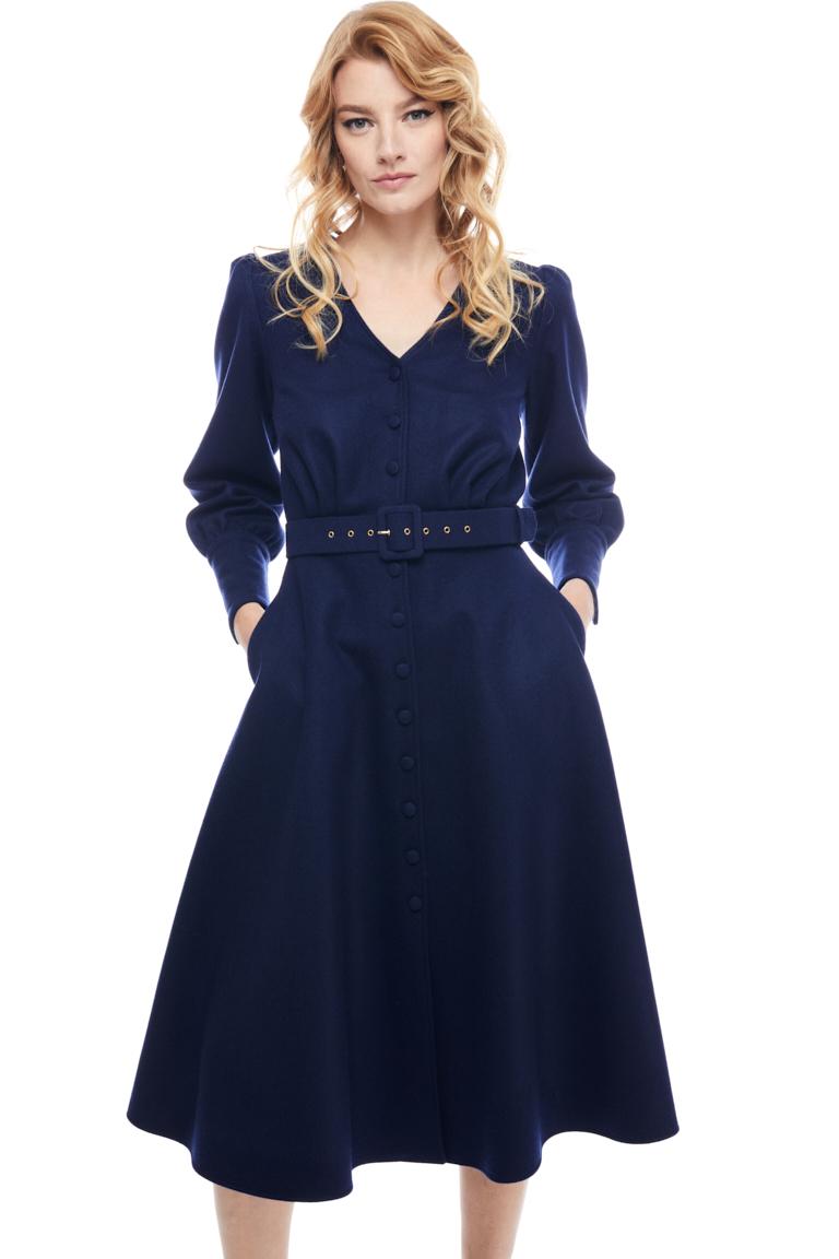 The Clarence Shirt Dress is made from wool with a V neckline, in-seam side pockets, and long cuffed sleeves. The fit-and-flare garment is unlined and boasts a flared full skirt. It comes with button front fastening and a matching waist belt. Complement the look with golden earrings.