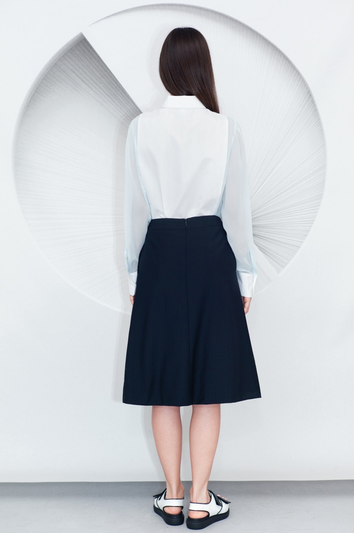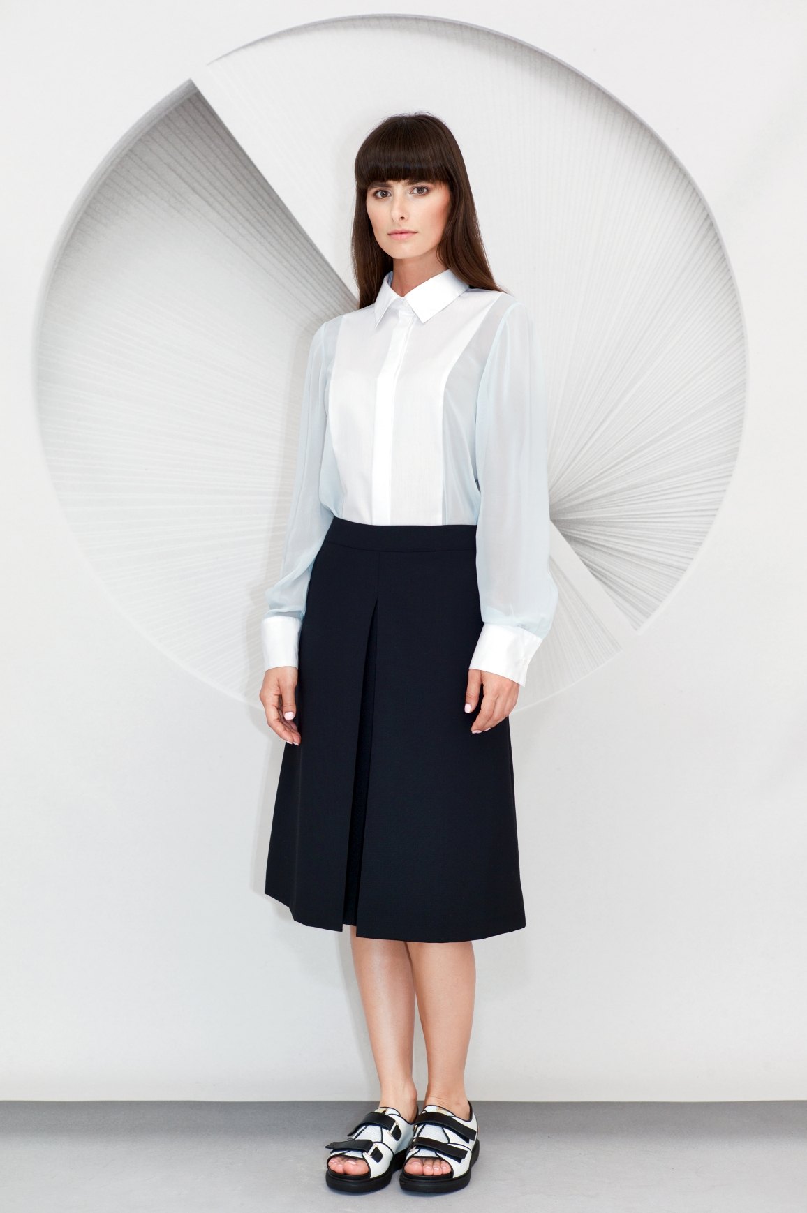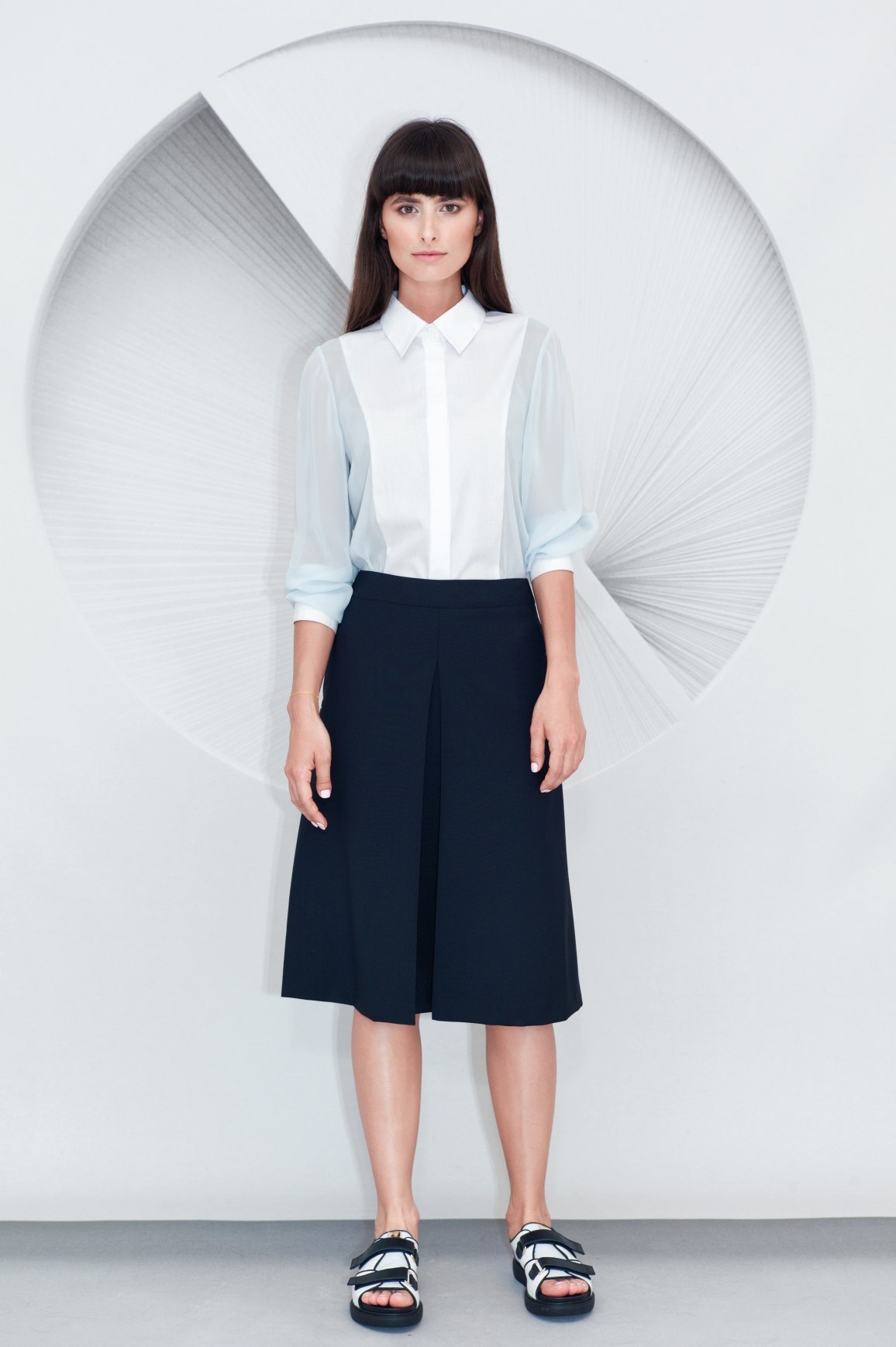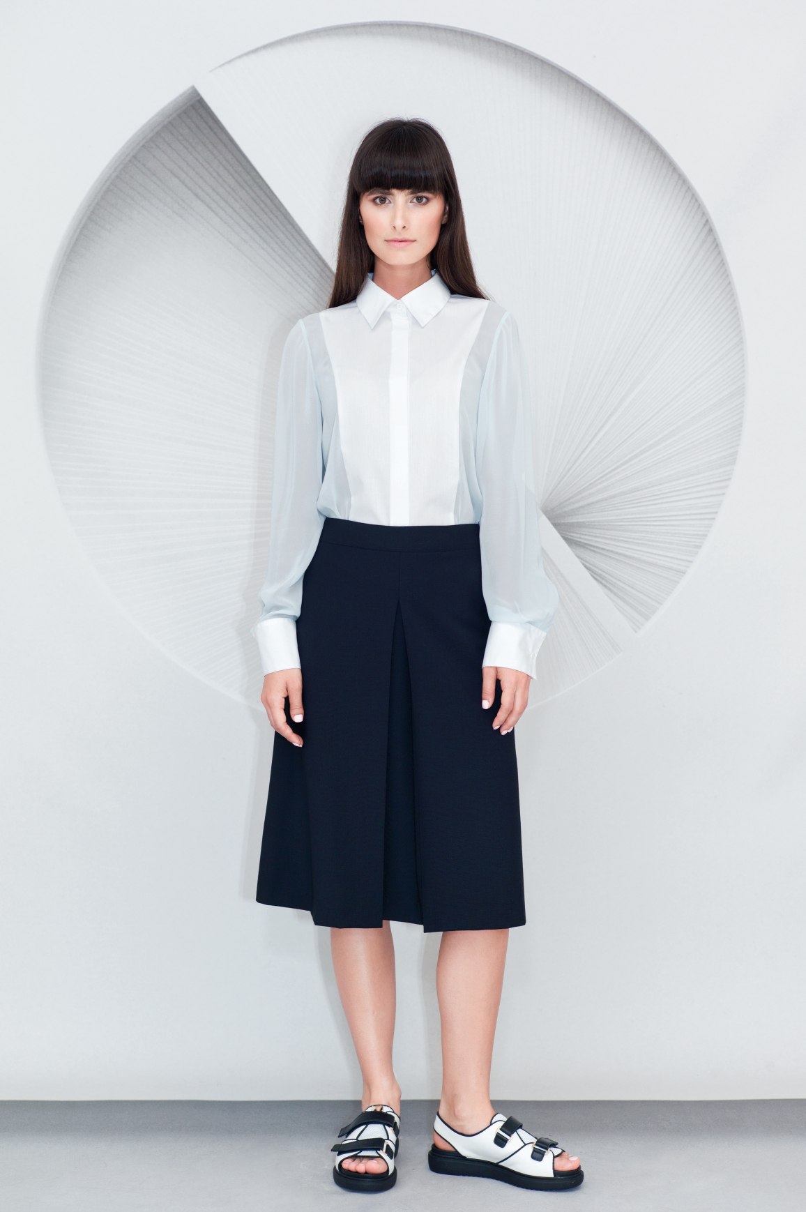 Made from fluid viscose with a contrast textured cotton panel along the front, this Cotton Viscose Shirt is a loose fit design. It has a neat collar, a concealed centre front button placket, hand sewn buttonholes and natural bone buttons.