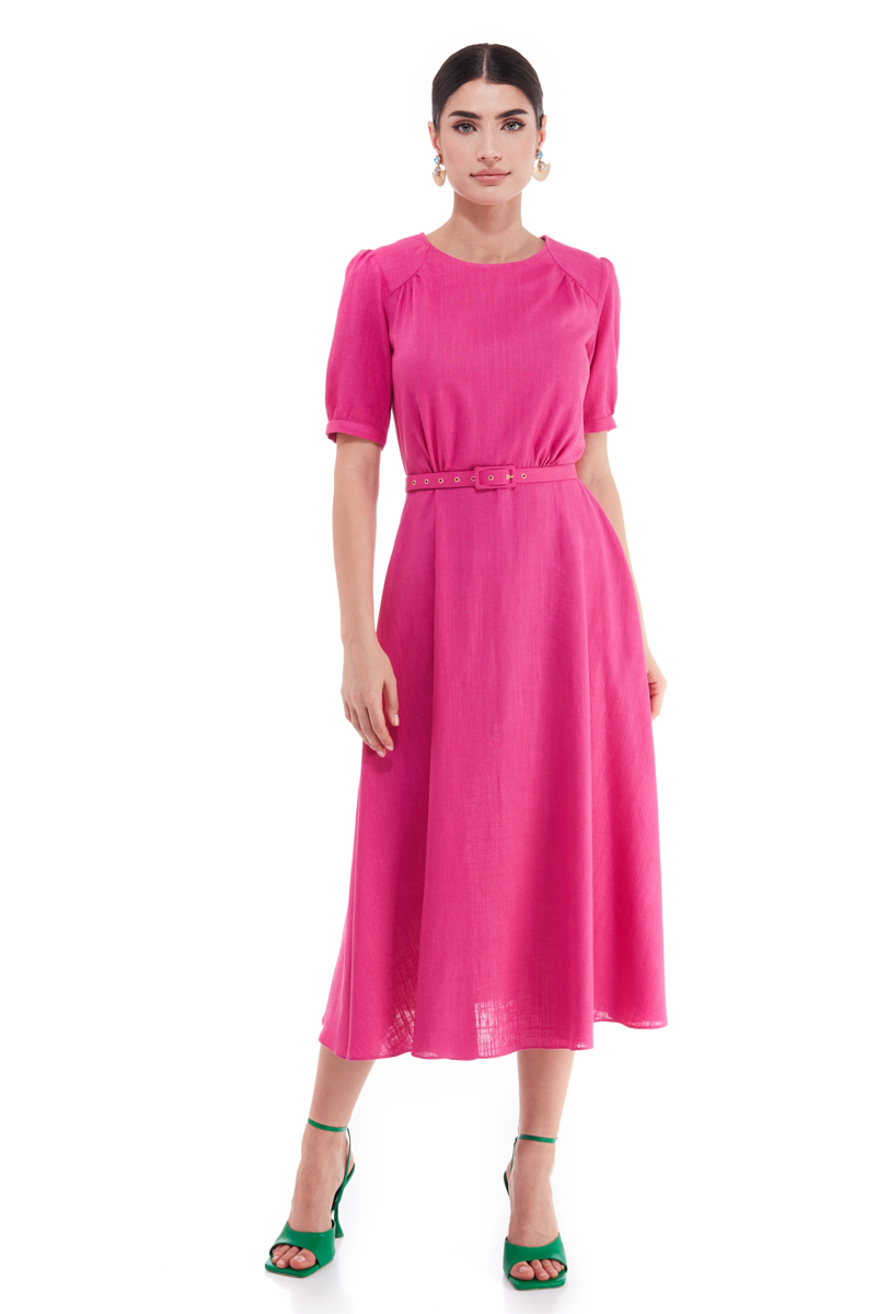 The Dalia Gathered Midi Dress has an elegant, simple silhouette. The cuff sleeves balance the round neckline. Artfully gathered along the shoulders, waist and cuffs, it features in seam side pockets and concealed zip fastening at back. Wear the tonal belt to accentuate your waist.