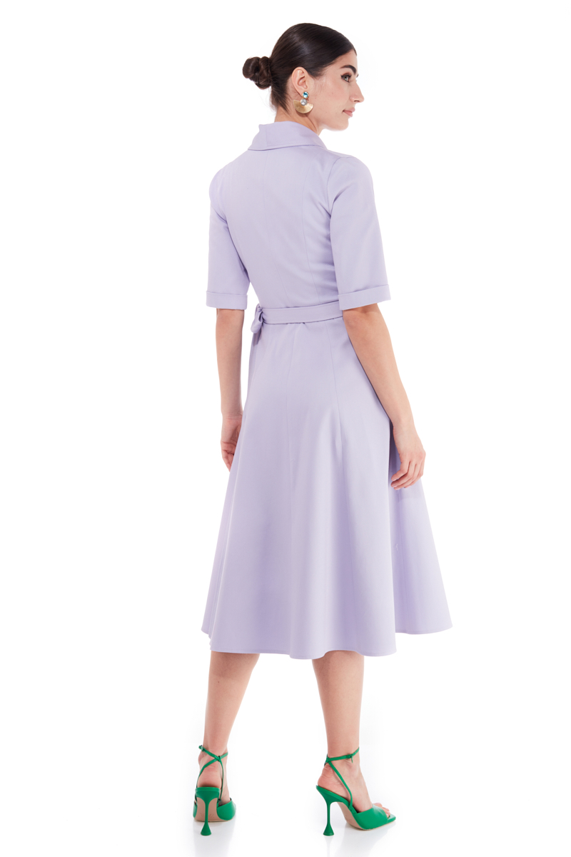 The Hydrangea Cotton Dress is cut in a flattering wrap silhouette, with shawl lapels and cropped sleeves. It has a built-in belt and in-seam pockets. Wear yours for a stylish office look.
