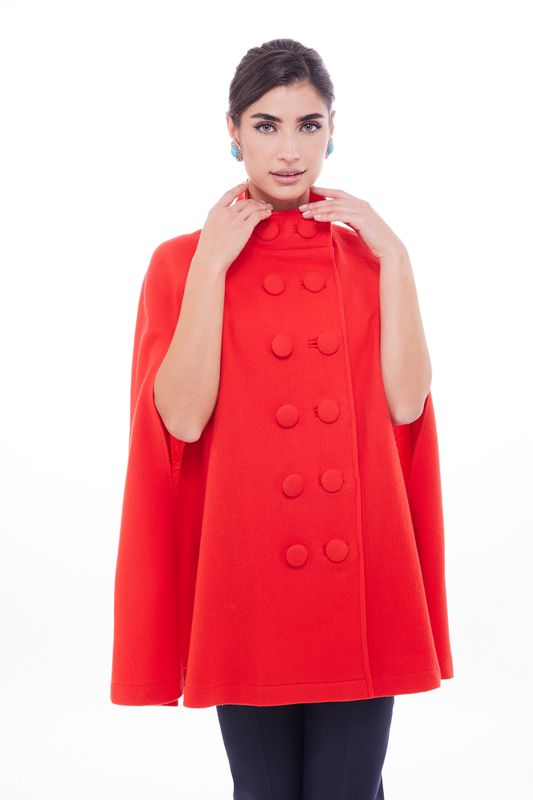 Intended for a loose fit, the Isabella Cape is made from wool with a high neck collar. With a double breasted front and tonal button fastening, it is the perfect layering piece for transitional weather.
