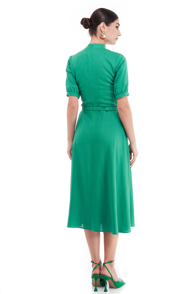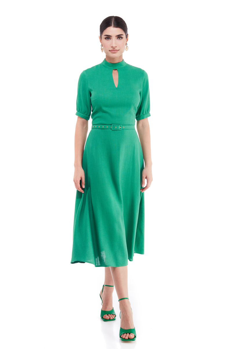 The Musa Dress is cut from soft viscose and linen blend. It features in seam pockets, concealed zip fastening at back and a tonal belt. It has a turtleneck and a front cutaway that beautifully frames your décolletage.