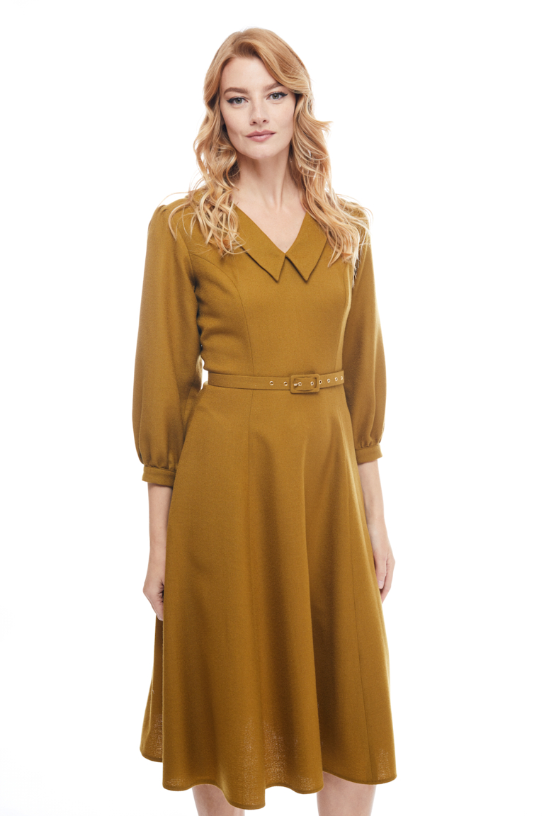 Made from wool, Tatiana Dress has a beautiful Chelsea collar. The puffed sleeves emphasize the floaty silhouette. It has in seam pockets, coordinating belt and concealed zip fastening at back.