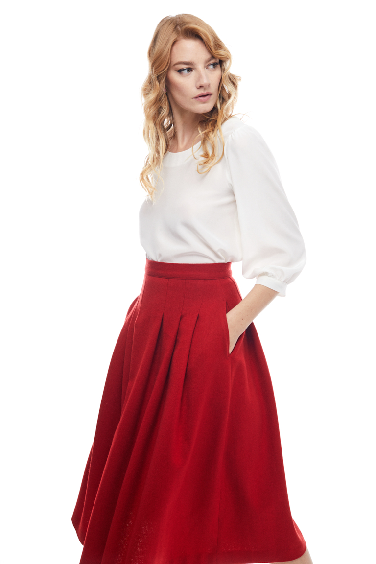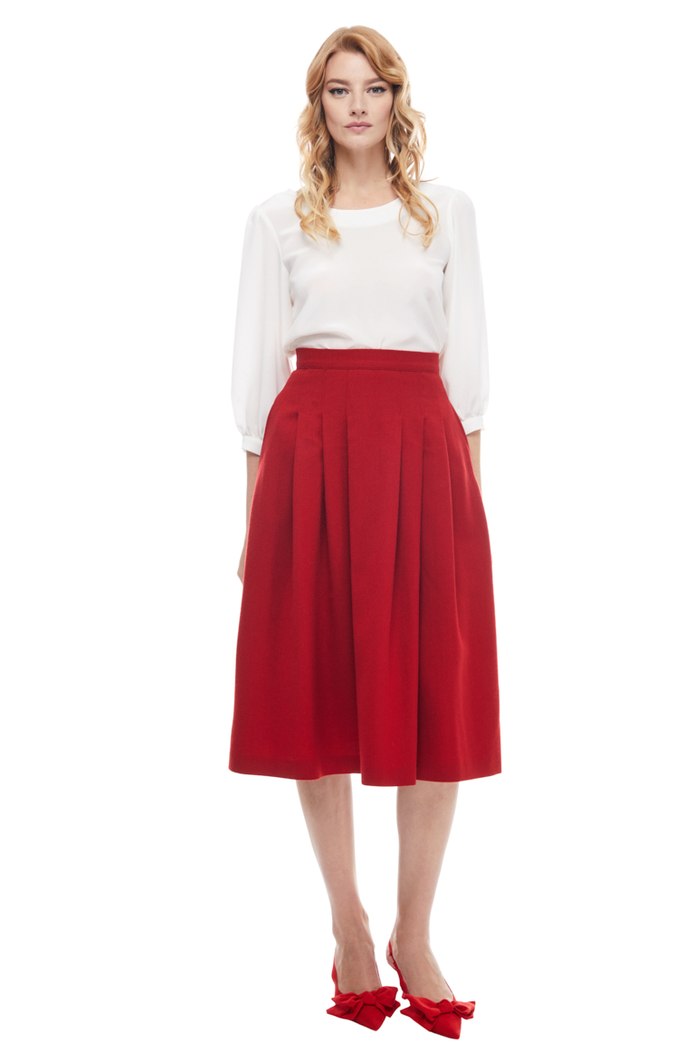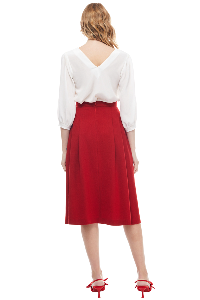 You’ll want to spend many winter days in this wool midi skirt. This classic red style falls from a high, fitted waist into a series of graceful loose pleats. It features in seam pockets and concealed zip fastening at back.